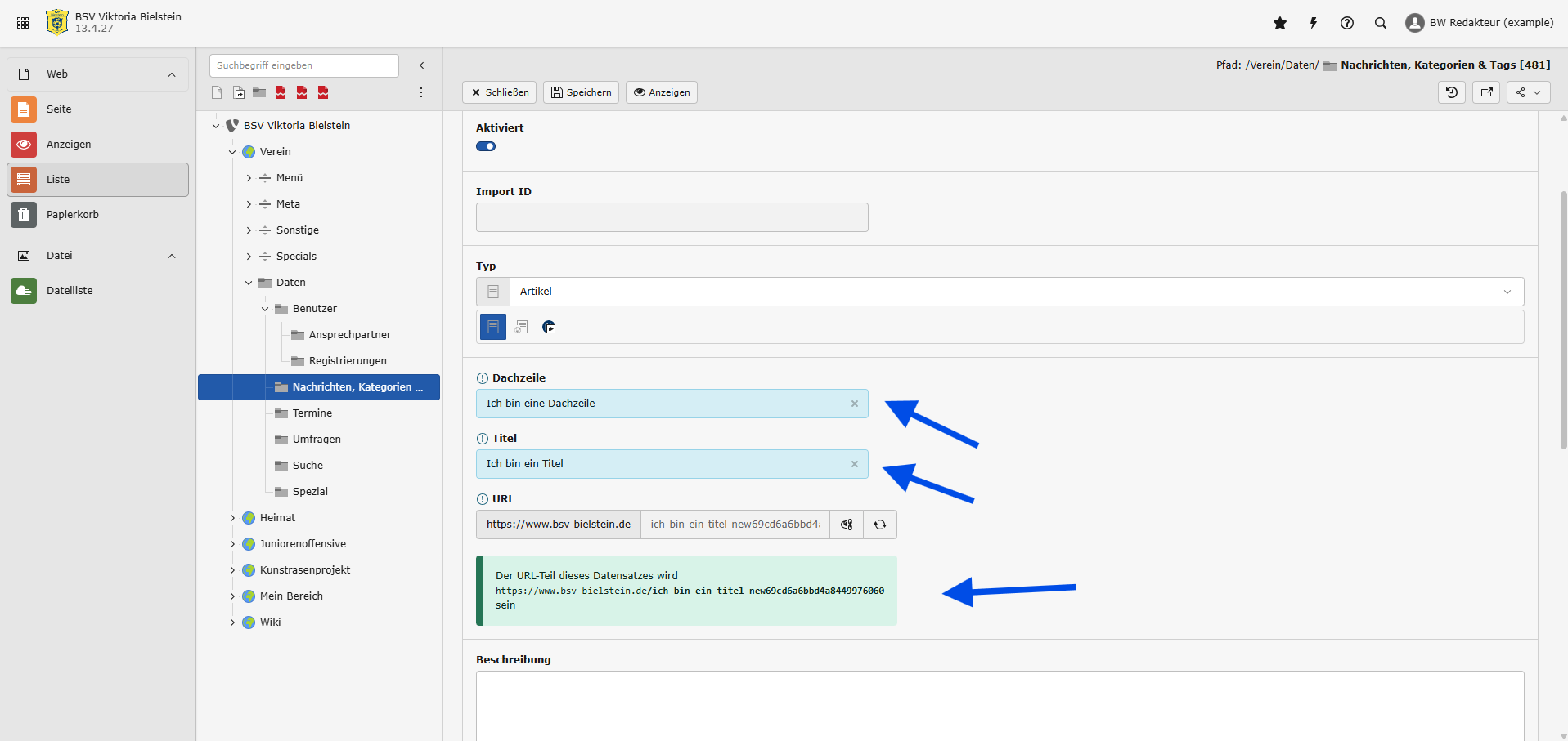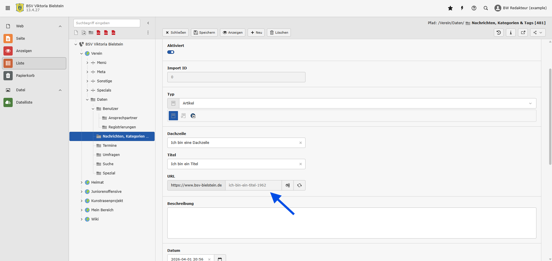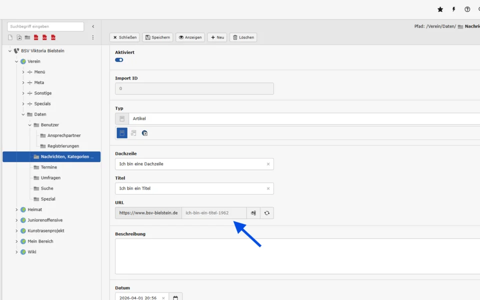 Wenn alle Informationen eingegeben sind, kannst du die Nachricht speichern. Beim erstmaligen Speichern eines Artikels wird die URL dabei so manipuliert, dass die Platzhalter-UID (beginnt mit “new”, vgl. Bild von Schritt 4) durch die tatsächliche UID des Artikels ersetzt wird.