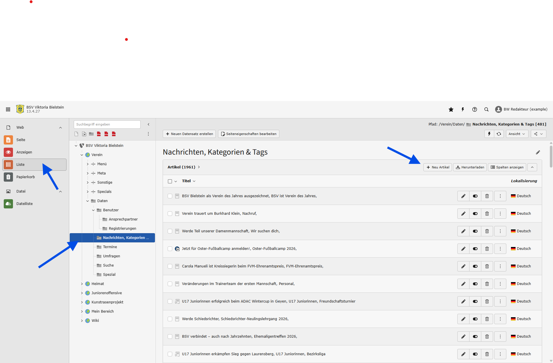 Wechsel nach der Anmeldung zunächst in das Listenmodul und wähle anschließend den Ordner Nachrichten, Kategorien & Tags (UID: 481) aus.