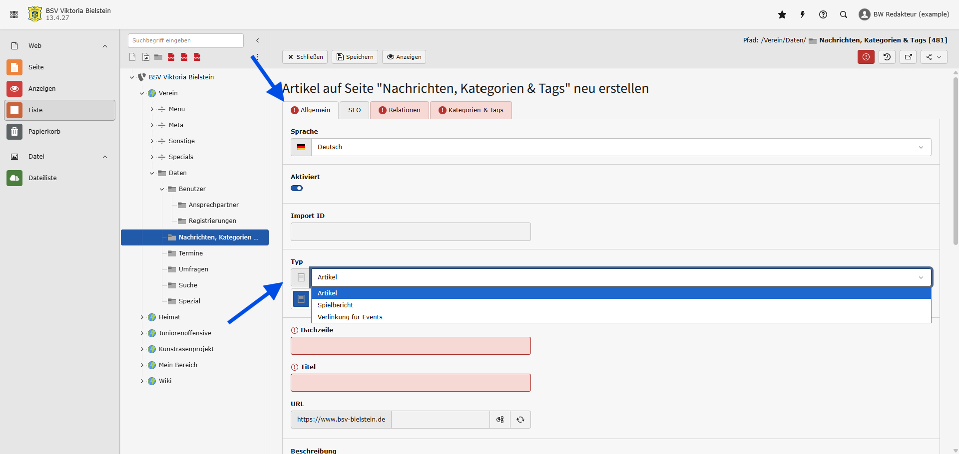 - Kategorie: Über die Kategorie wird geregelt, auf welcher Unterseite die Nachricht bzw. der Spielbericht ausgespielt wird